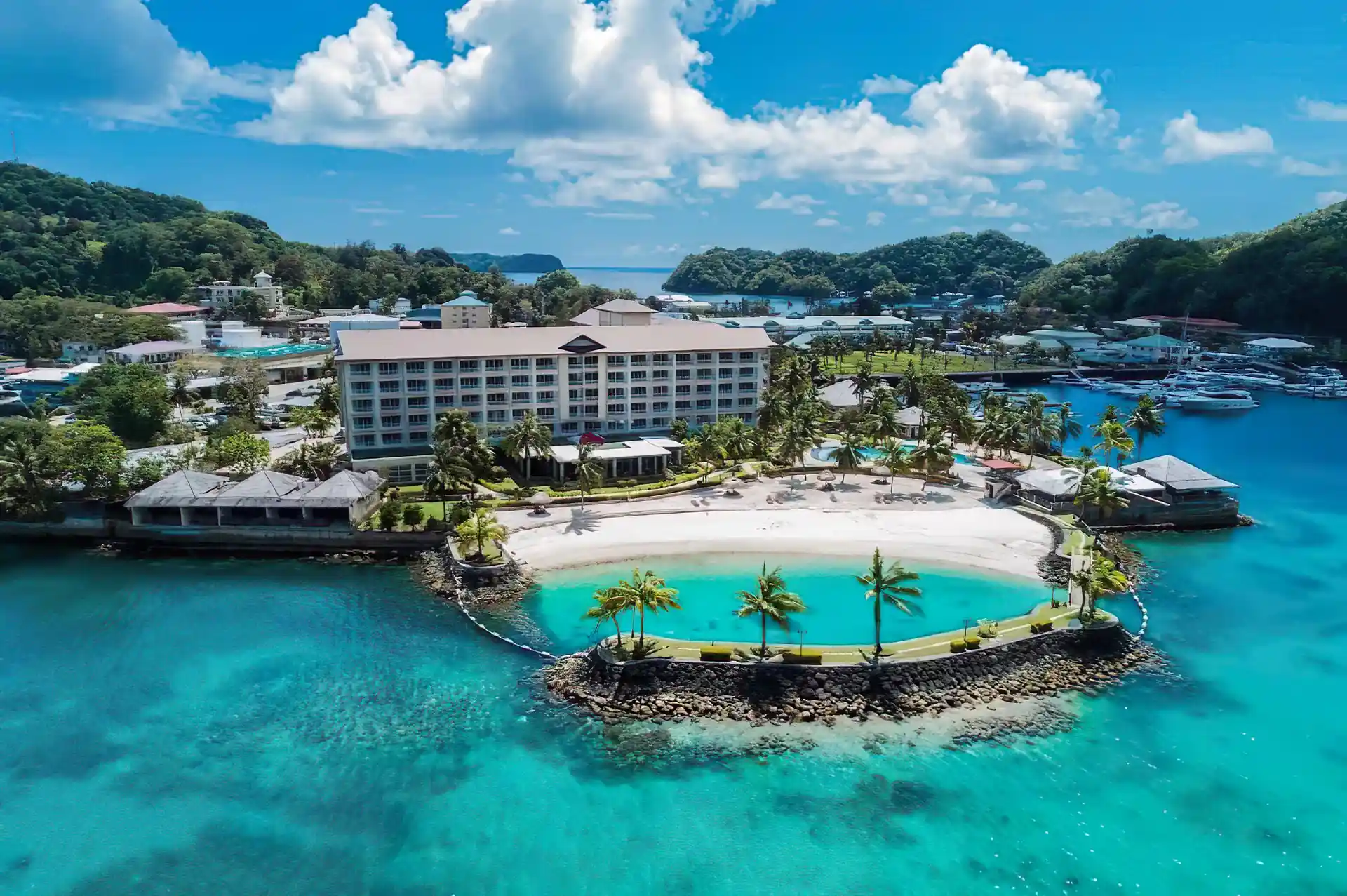 El hotel se encuentra a las afueras de Koror y ofrece un oasis de tranquilidad lejos del bullicio de la ciudad. El complejo se encuentra enclavado en cuidados jardines tropicales y cuenta con dos amplias piscinas rodeadas de tumbonas acolchadas y palmeras. Todas las habitaciones están recién decoradas y ofrecen balcón con vistas a la isla o al océano.